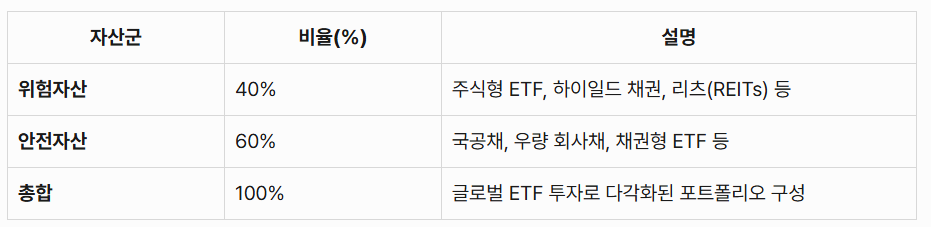 위험자산 40: 안전자산 60의 비율로 구성된 글로벌 ETF 중심의 자산 배분 전략은 안정성과 수익성을 동시에 제공합니다.