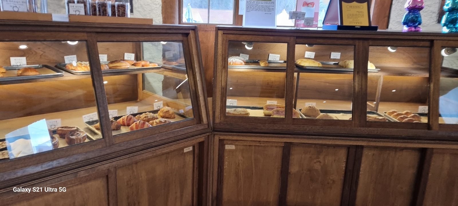 매장 왼쪽에 빵 진열대가 있어요.