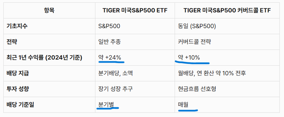 📍 다시 말해, 커버드콜 전략은 월배당 ETF의 ‘하위 전략 중 하나’ 일뿐이며, 투자자 입장에서는 수익 창출 방식이 다른 두 ETF를 비교하고 선택하는 것이 중요합니다.